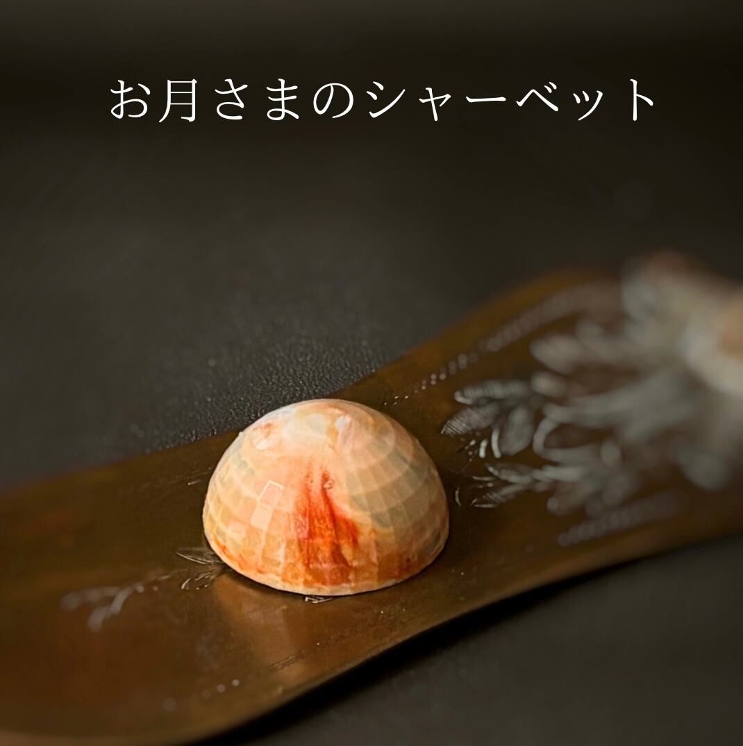 寝苦しいほど暑い夜に、溶け出したお月様の雫をおばあさんがタライに受けて、シャーベットにした、という「お月様のシャーベット」から、月の雫のシャーベットはどんな味なのかと想像して作りました。