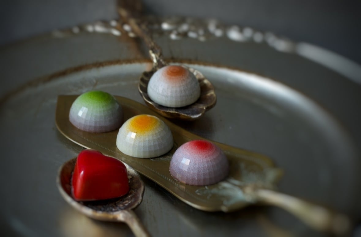 素材を組み合わせた5つのショコラ。